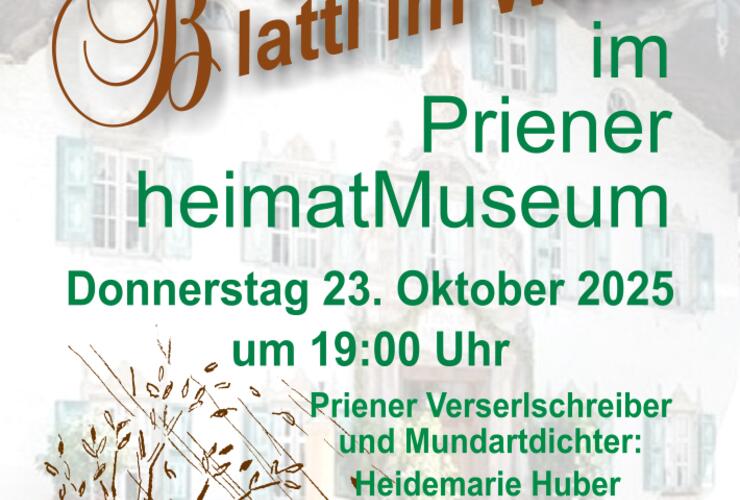 Die Priener Verserlschreiber, Heidemarie Huber, Helga Kohn, Lothar Rechberger, Sepp Obermüller und Ernst Reiter veranstalten im Priener Heimatmuseum wieder ihren traditionellen Herbst-Hoagascht. Am Donnerstag, 23. Oktober 2025 lesen sie ihre eigenen Gedichte und Geschichten und werden vom Harfenduo Fischer musikalisch begleitet. Beginn ist um 19 Uhr, Eintritt ist frei, gerne wird aber eine Spende angenommen.