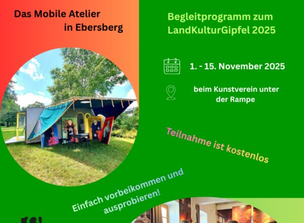 Begleitprogramm zum LandKulturGipfel 2025 1.-15. November 2025 in Ebersberg Mobiles Atelier in Ebersberg, 1. bis 15. November 2025 Zeitgenössische Kunst soll allen Menschen offenstehen – unabhängig von ihrem Wohnort, den örtlichen...