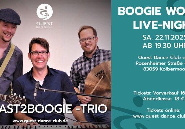 Nach dem großartigen Abend im letzten Jahr dürfen wir das 2fast2 Boogie-Trio erneut bei uns begrüßen! Die Musiker rund um Stefan Eberle (Piano/Gesang) – vielen Tänzern bereits bekannt durch seine Auftritte mit den FunTasten – bringen wieder...