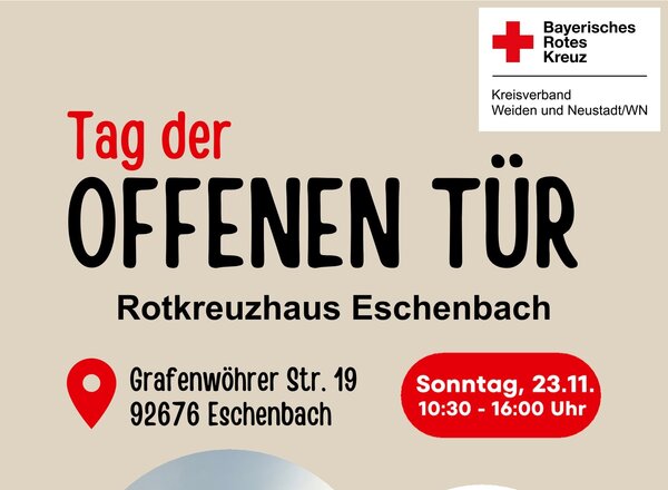 Tag der offenen Tür am Rotkreuzhaus Eschenbach am Sonntag, 23.11.25 von 10:30 - 16:00 Uhr. Weißwürste und Brezen, Essen vom Grill, Kaffee und Kuchen Kinderbelustigung, Tombola, Fahrzeugschau uvm. Es gibt einen Shuttle-Service