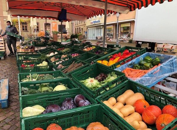 Am grünen Wochenmarkt werden saisonale Produkte angeboten.
