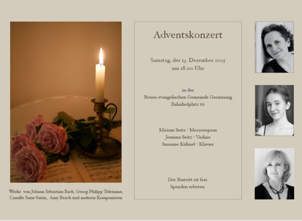 Kammermusikalisches Adventskonzert mit Geistliche Arien und Lieder von Johann Sebastian Bach, Georg Philipp Telemann, Camille Saint-Saëns, Amy Beach und anderen Komponisten. Der Eintritt ist frei. Um Spenden wird gebeten.
