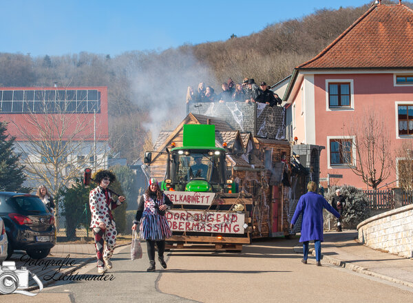 Ein kleiner und feiner Faschinxzug mit bunten Wägen, Fußgruppen, sowie der Blaskapelle Obermässing. Am Ende des Zuges werden am Dorfplatz die lustigen Missgeschicke in der Dorflitanei vorgetragen. Im Anschluss zieht das Prinzenpaar mit Tanzgruppen...