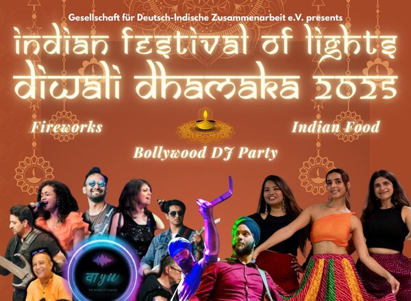 Die Gesellschaft für Deutsch-Indische Zusammenarbeit e.V. freut sich sehr, Sie zum 16. indischen Lichterfest Diwali 2025 in München einzuladen. Genießen Sie: BOLLYWOOD TANZ BOLLYWOOD DISCO VOLKSTANZ LIVE MUSIK FEUERWERK INDISCHES ESSEN Karten: €15...