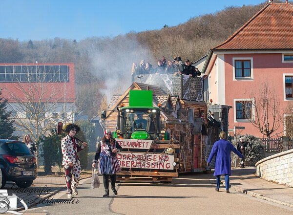Ein kleiner und feiner Faschinxzug mit bunten Wägen, Fußgruppen, sowie der Blaskapelle Obermässing. Am Ende des Zuges werden am Dorfplatz die lustigen Missgeschicke in der Dorflitanei vorgetragen. Im Anschluss zieht das Prinzenpaar mit Tanzgruppen...