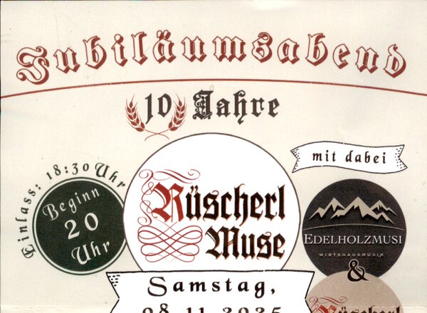 Anl. Jubiläumsabend "10 Jahre Rüscherl Muse" unterhalten "Rüscherl Muse" mit 7er Besetzung und Wirtshausmusik "Edelholzmusi". Einlass um 18:30 Uhr Kartenvorverkauf unter www.ruescherl-muse.de o. Tourist-Info Pleystein