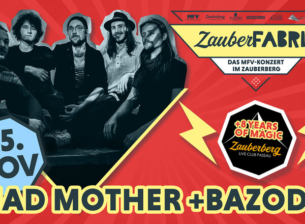 Mad Mother + Bazodee ZauberFabrik - Das MFV-Konzert im Zauberberg Samstag, 15.11.2025 ab 19.30 Uhr >> HIER KLICKEN & TICKETS SICHERN! >> SPECIAL EDITION - 8 YEARS OF MAGIG ZAUBERBERG BIRTHDAY BASH Der Zauberberg feiert...